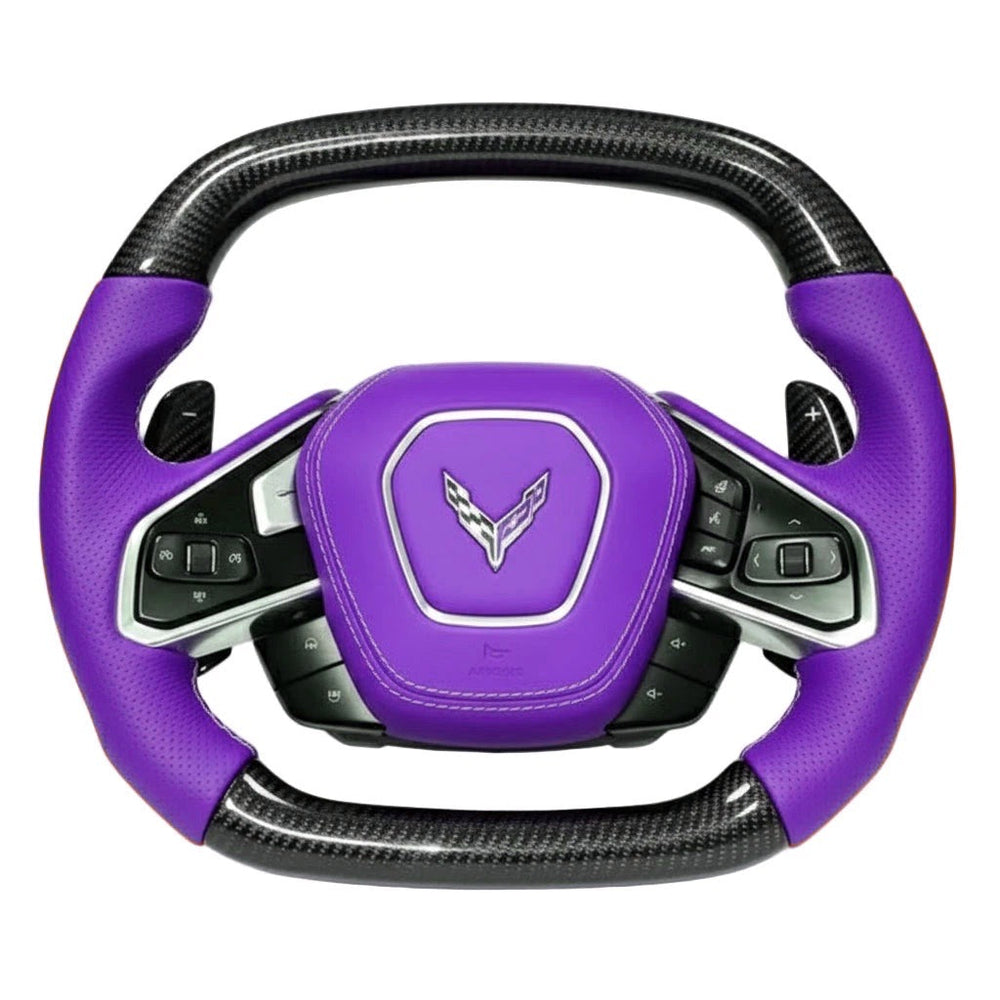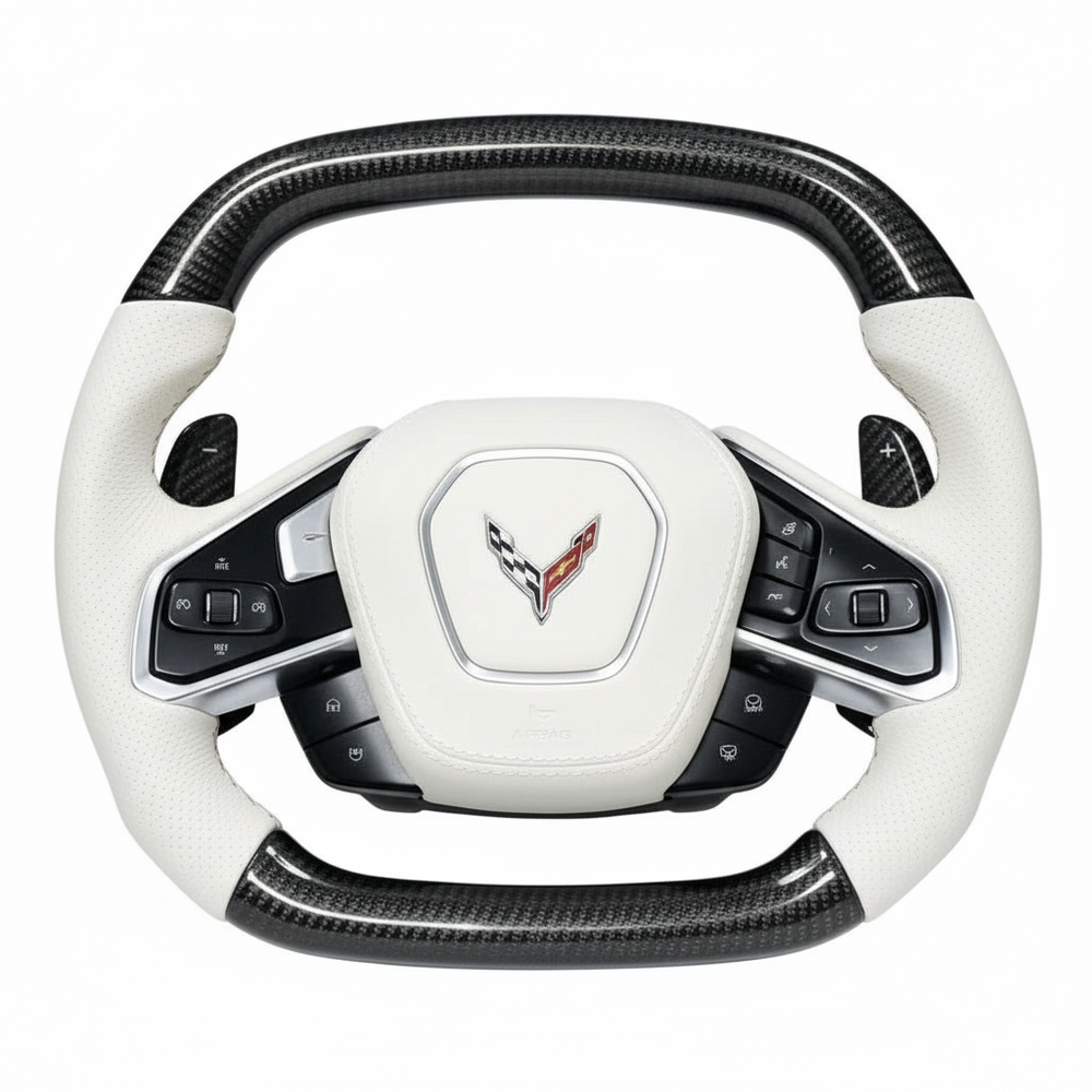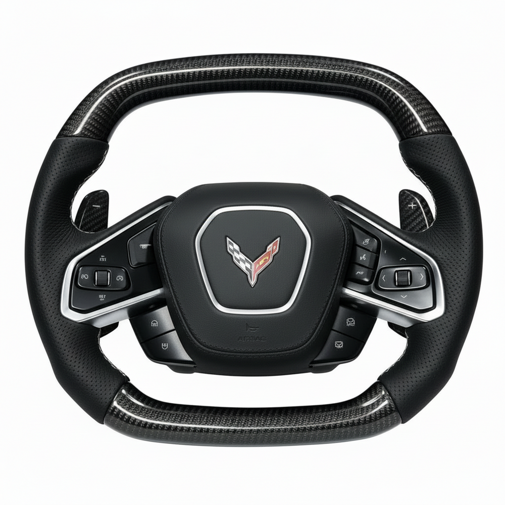 Upgrade your C8 Corvette interior with our preset carbon fiber steering wheel, precision-built from an OEM Corvette core for perfect alignment, safety, and an unmistakably exotic appearance.